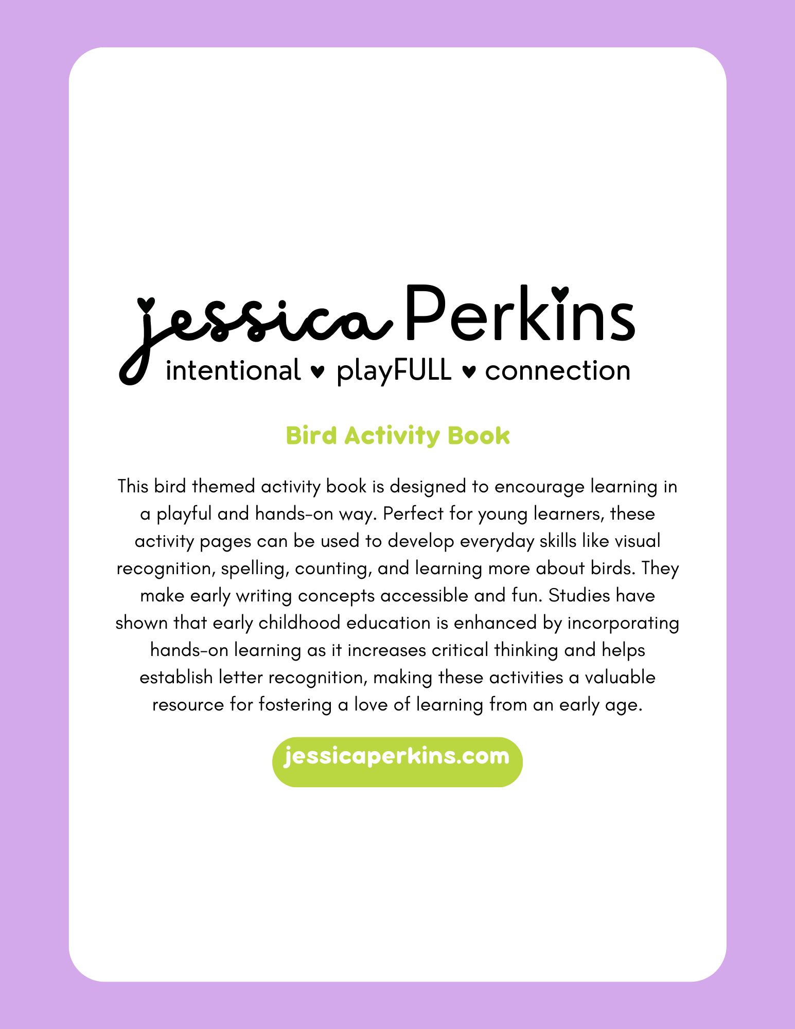 This bird-themed activity book is designed to encourage learning in a playful and hands-on way. Perfect for young learners, these activity pages can be used to develop everyday skills such as visual recognition, spelling, counting, and learning about birds. They make early writing concepts accessible and fun. Studies have shown that incorporating hands-on learning into early childhood education enhances it, increases critical thinking, and helps establish letter recognition, making these activities a valuable resource for fostering a love of learning from an early age.
